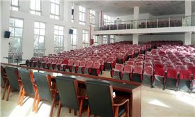 四川阿壩州高校的多功能廳分為兩層,大概能容納六七百人,樓層較高,長度較長,形狀為近似長方形,為確保后場的清晰度和前后場聲壓級的均勻度,主擴聲系統由傳統的左、右主擴聲揚聲器LAB-610線陣音箱組成。會議話筒根據主席臺上發言人數,配置了3套無線話筒,該話筒信噪比高,穩定可靠,抗干擾強,靜噪性能好,是專用于會議室多功能廳的話筒,可以適用于臺下觀眾發言或走動中發言,能有效減少話筒出現嘯叫的情況。舞臺前方配置了兩只12寸的舞臺返聽音箱。