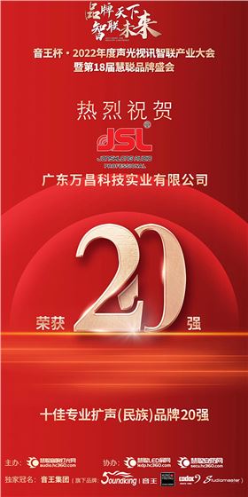 2022年度聲光視訊智聯產業大會暨第十八屆慧聰品牌評選活動第一階段的企業海選20強今日揭曉!JSL爵士龍成功晉級專業擴聲系統(民族)品牌20強!真誠感謝所有支持JSL爵士龍的朋友們,感謝您們在百忙之中投JSL爵士龍一票。